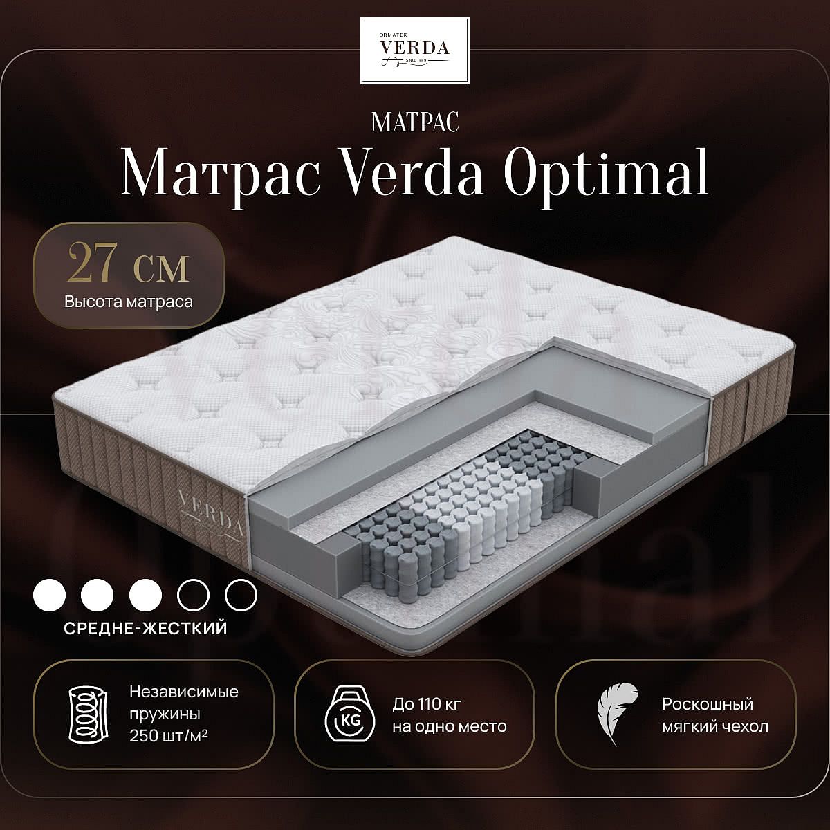 Матрас Verda Optimal – премиальный односторонний матрас с уровнем жесткости выше среднего. В нем сочетаются изысканные материалы, ручная работа и передовые технологии для того, чтобы каждая ночь наполнялась настоящим ощущением роскоши и покоя.Матрас подстраивается под тело с особой точностью так, что во время сна не придется искать удобную позу. Благодаря независимому блоку и высокоплотной пене ваш позвоночник будет идеально выровнен, а натуральные материалы создадут идеальный микроклимат. Преимущества матраса Verda Optimal: